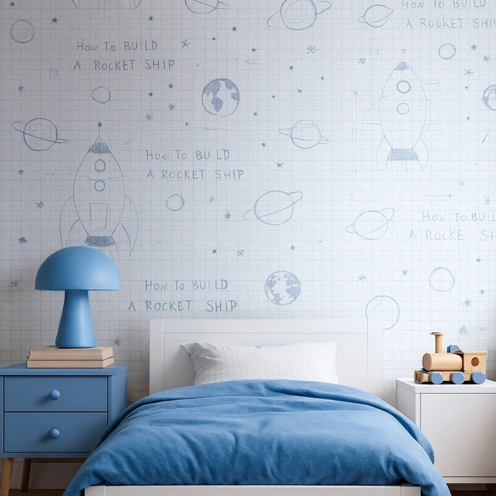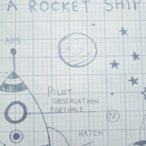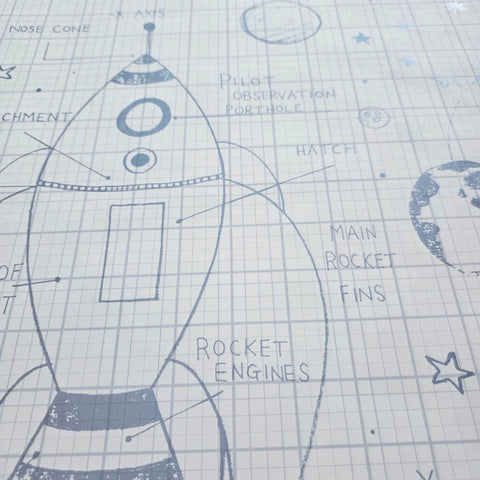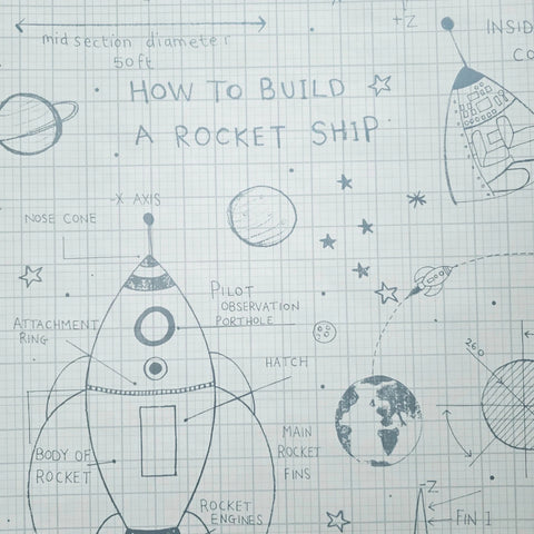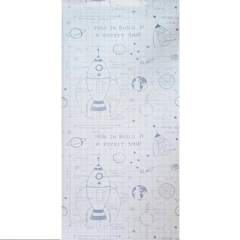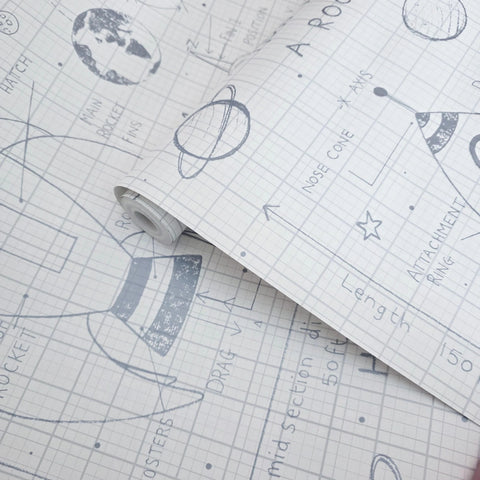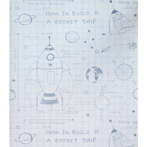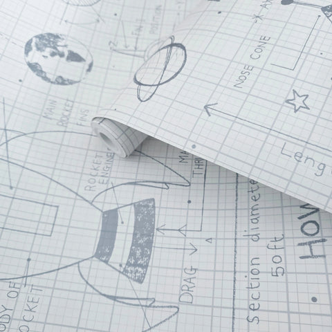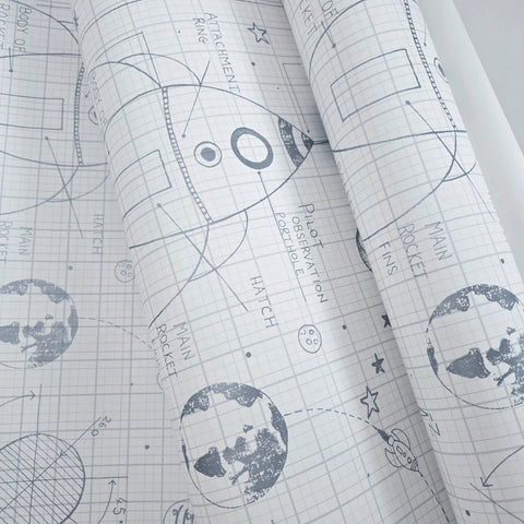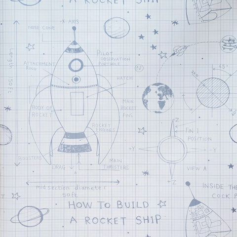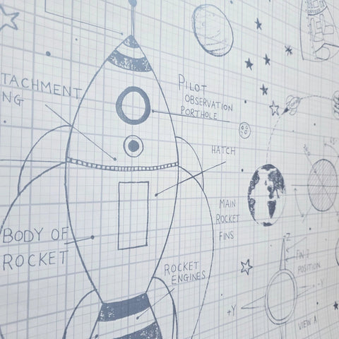 KJ50100 Gray off white grid Rocket Ship Diagram drawing kids play nursery room Wallpaper