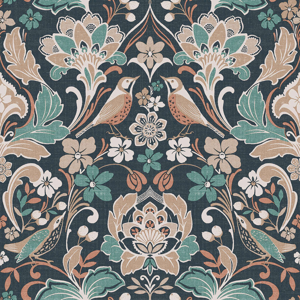 AH100197AH Birdy Navy Nuthatch Floral Wallpaper