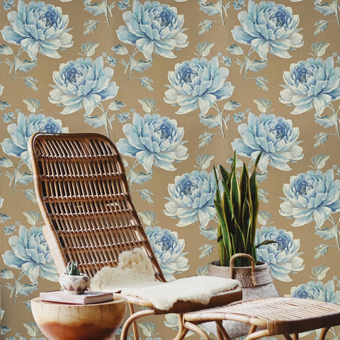 CR21302 Bronze metallic blue floral large peony blossom flowers Biedermeier wallpaper 3D