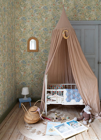 This lovely wallpaper with a Scandinavian sensibility will make you feel as though you're entering a storybook. Against a sandy-white background, the wooded village's charming homes, robust oaks, flower gardens, and animal companions are all painted in shades of green, blue, red, and yellow.