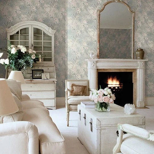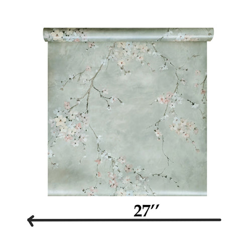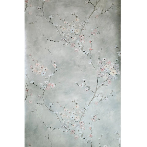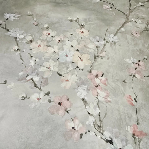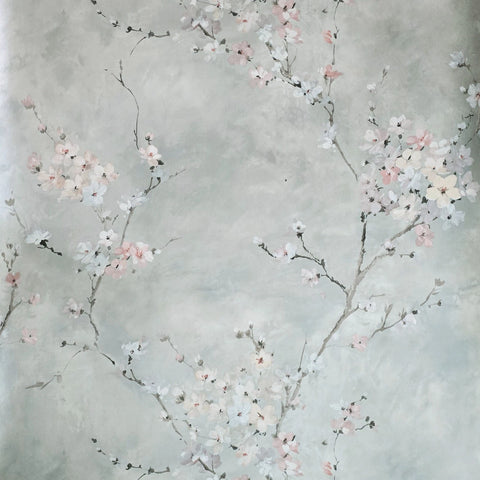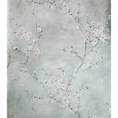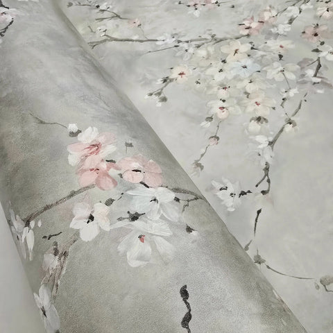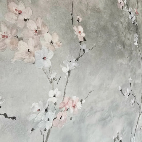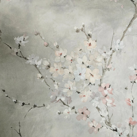 CB90208 Gray silver watercolor white pink cherry blossom branches Chinoiserie wallpaper