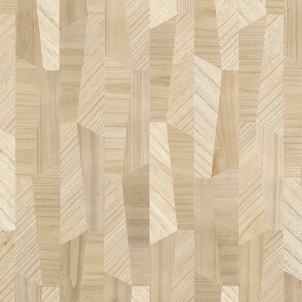 Cork wallcoverings and real wood veneer give any room a cozy, organic feel. Real wood is chopped into thin veneers, dyed, and hand-laid into a nearly seamless geometric design.