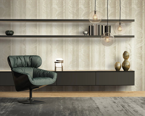 Hohenberger's Adonea collection offers gorgeous PVC-free wallpapers that blend contemporary sustainability with vintage luxury. These traditional damasks produce a distinctive play of light and an air of refined elegance in the interior thanks to the use of genuine glass beads and shimmering effects.