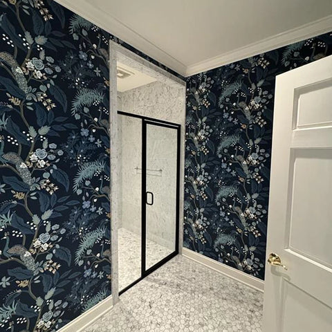 RI5170 Black gray olive bronze Tropical tree branches leaves flowers peacock Wallpaper
