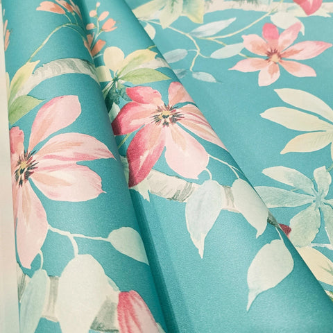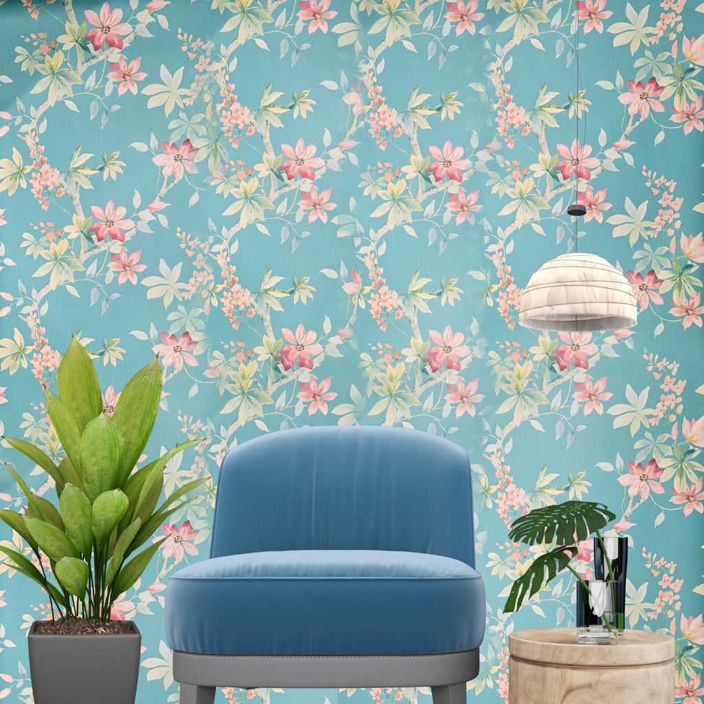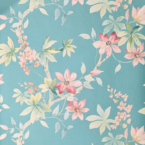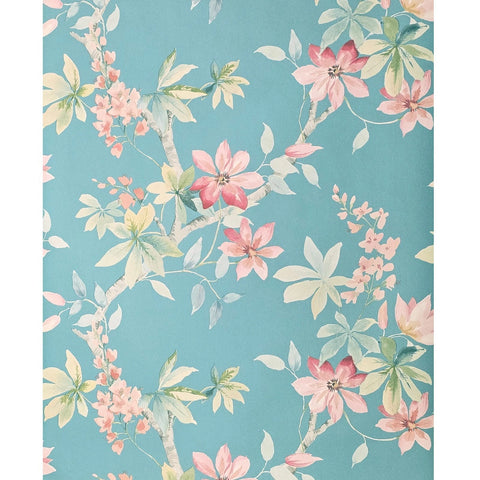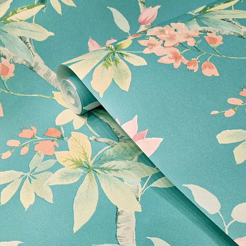 CR20812 Teal blue green tree branches leaves blooming pink flowers botanical Wallpaper