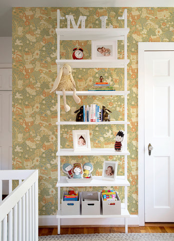 This lovely wallpaper with a Scandinavian sensibility will make you feel as though you're entering a storybook. Against a sandy-white background, the wooded village's charming homes, robust oaks, flower gardens, and animal companions are all painted in shades of green, blue, red, and yellow.