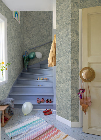 This lovely wallpaper with a Scandinavian sensibility will make you feel as though you're entering a storybook. Against a sandy-white background, the wooded village's charming homes, robust oaks, flower gardens, and animal companions are all painted in shades of green, blue, red, and yellow.