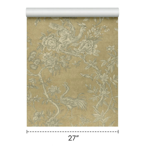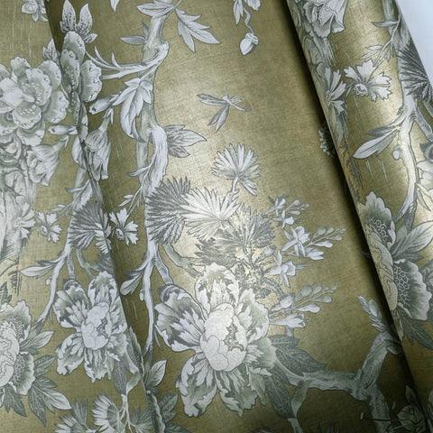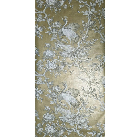 AF41305 Gold foil metallic gray Chinoiserie blooming peonies branches cranes wallpaper