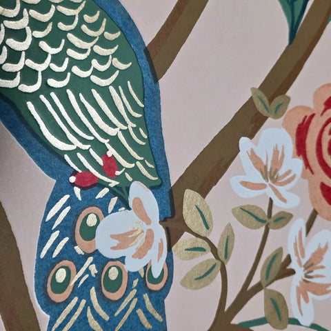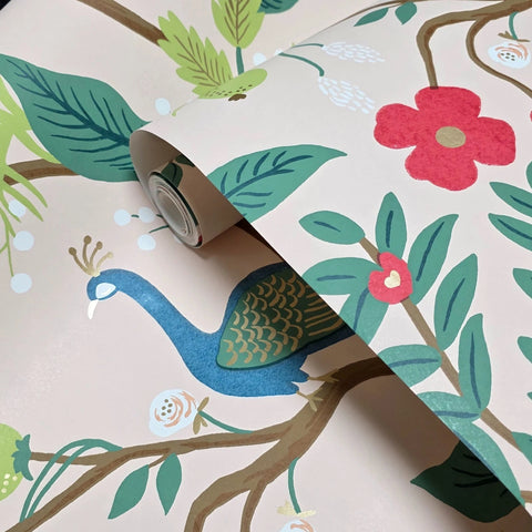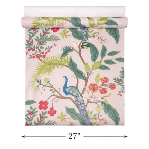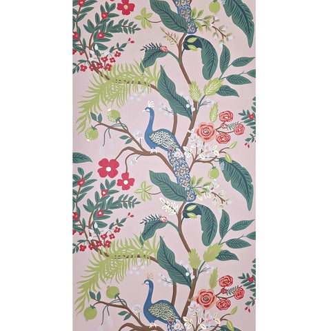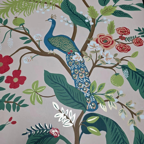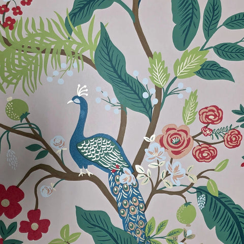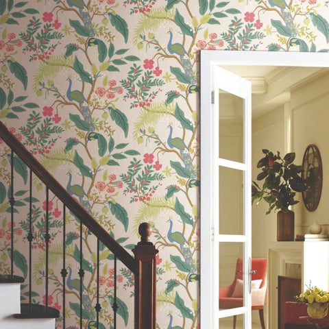 RI5169 Pink red blue green Tropical tree branches leaves flowers peacock bird Wallpaper