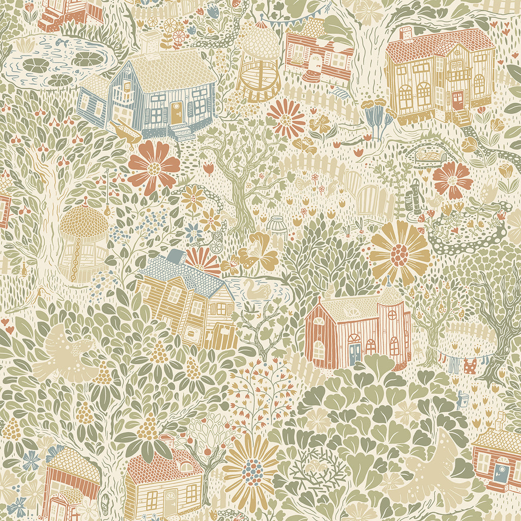 This lovely wallpaper with a Scandinavian sensibility will make you feel as though you're entering a storybook. Against a sandy-white background, the wooded village's charming homes, robust oaks, flower gardens, and animal companions are all painted in shades of green, blue, red, and yellow.